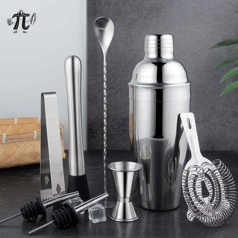 Gran oferta, accesorios para Bar de 10 piezas, Kit de barman, juego de coctelera de acero inoxidable con soporte de Bambú